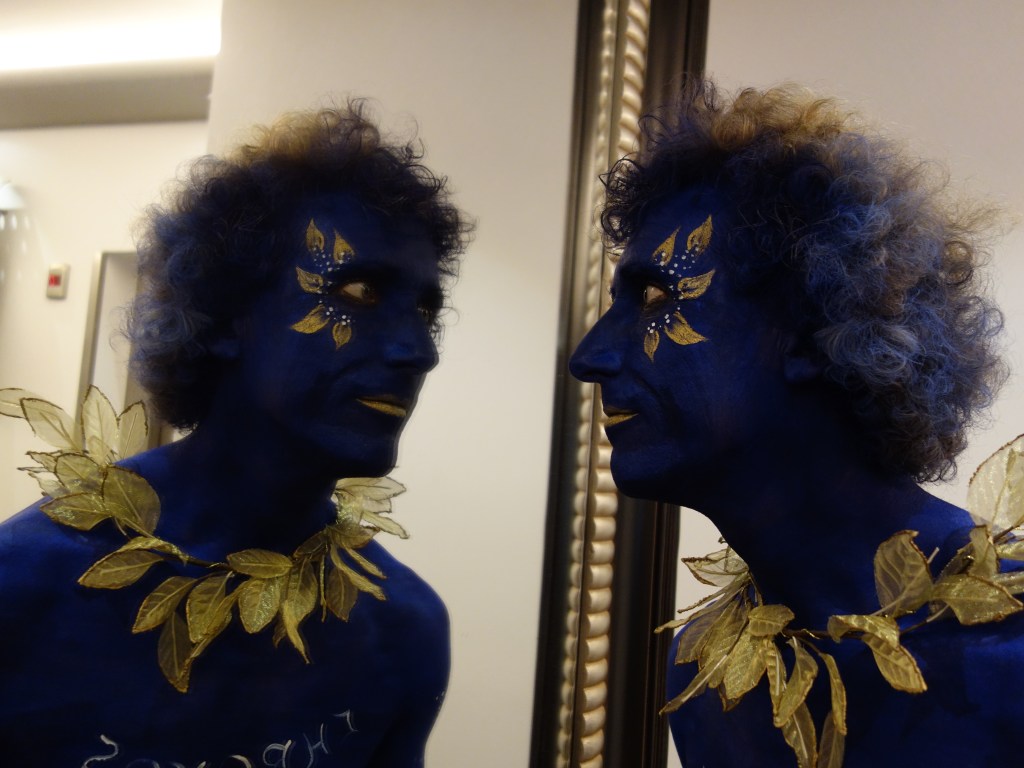 Au moment où Roger m’a engagée pour faire le maquillage, un engagement professionnel s’entend, avec rémunération, je me suis dit qu’il fallait que je trouve une idée. J’avais expliqué que lors de mes maquillages, l’intuition me faisait parfois sentir et mettre en évidence la façon d’être de la personne. Marcel, celui qui est devenu « Cronos bleu » m’a demandé de lui dire comment je le voyais. Mais là, ai-je répondu spontanément, il s’agissait de peindre comme s’il avait été un tableau. Je dois dire que c’est tout ce que je savais. De plus, ai-je epxliqué, je ne sais jamais ce que je vais faire avant d’avoir la personne assise devant moi et le pinceau en main. Et même là, je ne sais pas. Une partie de moi le sait puisque je trempe le pinceau dans telle ou telle couleur, que je fais telle ou telle forme, mais je ne peux pas dire que je le sais d’avance.