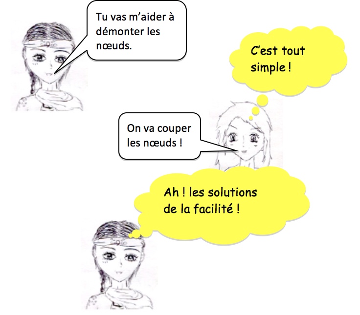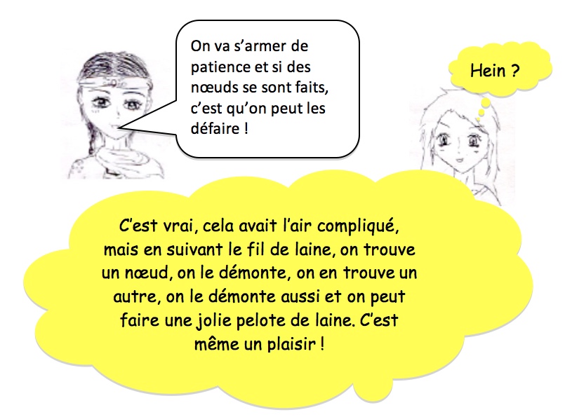 Je propose à mon élève de faire une pelote (il faut préciser que j’avais des écheveaux) et là, il n’y aura plus de noeuds !
