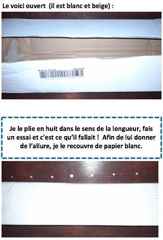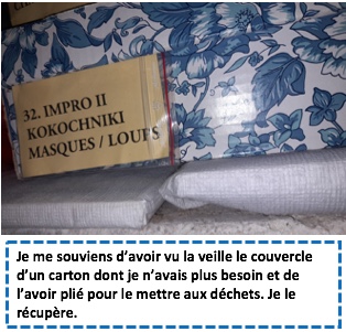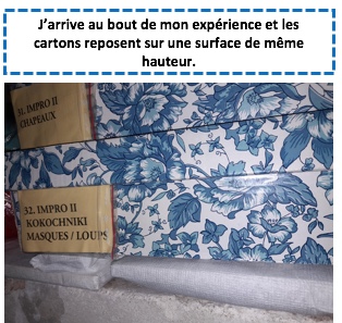 Cette fois-ci, je range mes cartons contenant des costumes et m’aperçois qu’il y a un tas qui ne repose pas sur une surface de même hauteur. Il n’y a pas d’autre endroit pour les cartons. Il faut trouver une solution.