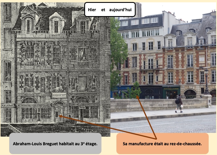 La maison Breguet originale était en tous points semblable à celle d’à côté – vitrine entourée en vert avec l’écriteau en jaune – où se trouvent depuis 1830 les Papeteries Gaubert. La maison Breguet abrite encore des membres de la famille. C’est très touchant. Quant au nombre d’étages, le 3e, celui où a habité A.-L. Breguet, a été modifié , avancé, et on a ajouté deux étages.