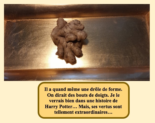 Gengis Khan ! Le soir, en faisant je ne sais quoi, je me dis que c’est le moment de boire de l’eau chaude avec un peu de citron – cela je le fais souvent – et, suivant le conseil de Michaël, de lui ajouter un tout petit peu de gingembre. J’ai donc râpé un rien de gingembre et j’ai bu. C’est allé. À un certain moment, je laisse passer dans la bouche un rien de gingembre, je le mâche et là… c’est Gengis Khan le conquérant, l’envahisseur asiatique de terres qui envahit mon système lacrimal. Tonneau, que c’est fort ! J’envoie un mot à Michaël pour lui parler de ce conquérant et il m’envoie une description des vertus de la plante. Après quoi je réponds qu’effectivement, ils avaient oublié de parler de Gengis Khan. On a bien rigolé.