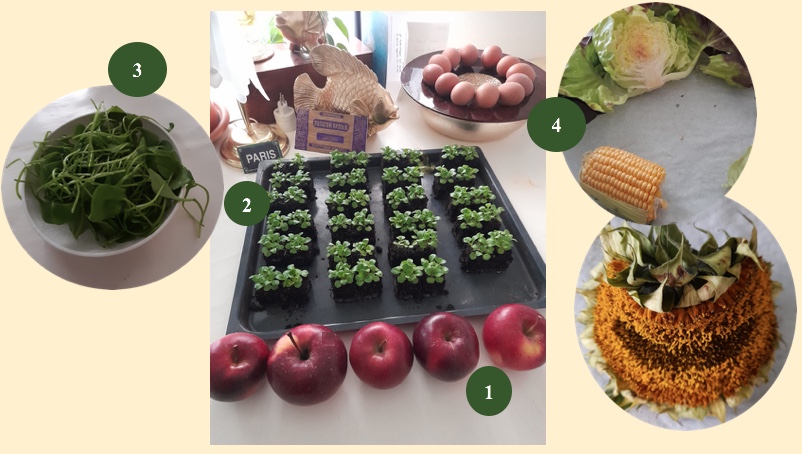 No 1, c’est Michaël, le petit-fils de Mme Hélène Pellet qui me les a vendues en me disant : « C’est comme celles de Blanche Neige ». J’en ai pris cinq, chiffre du changement ; no 2, c’est Peter Künzi qui m’apporte des pieds de salade, en un rien de temps le terrain est… nettoyé par les canaris ; no 3, c’est un nouveau vendeur, Matthieu, du stand de feu les Reubi et où travaillait Paul qui m’a fourni du pourpier ; no 4, c’est au stand où travaille Mme Aubert, la star du stand, que je trouve salades, oeufs, maïs et même un tournesol qui rigole !