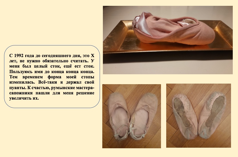 Танцовщица должна уметь зашивать тапочки, чтобы починить их. Касатетльно этих пуантов, они волшебные. У меня некогда не болели ноги в них и особенно я могла сразу встать на пуанты. Пояснение для тех, кто никогда не носили пуанты : часто необходимо « раздавить » пуанты, чтобы можно было надеть их. Займусь этим делом на днях. Дело в том что эти пуанты очень подходят мне . Они созданы для меня !