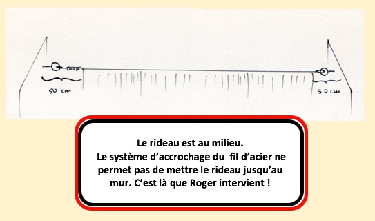 Du tissu. Roger fait une proposition pour mettre du tissu. La proposition a été surprenante, mais intéressante. Je réfléchis et de ses idées une autre naît dans mon esprit. Des crochets qui maintiennent le câble qui porte les rideaux, il va accrocher un autre câble et j’étendrai du tissu entre les deux bords. Cela donnera ceci :