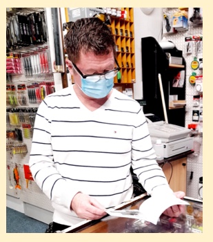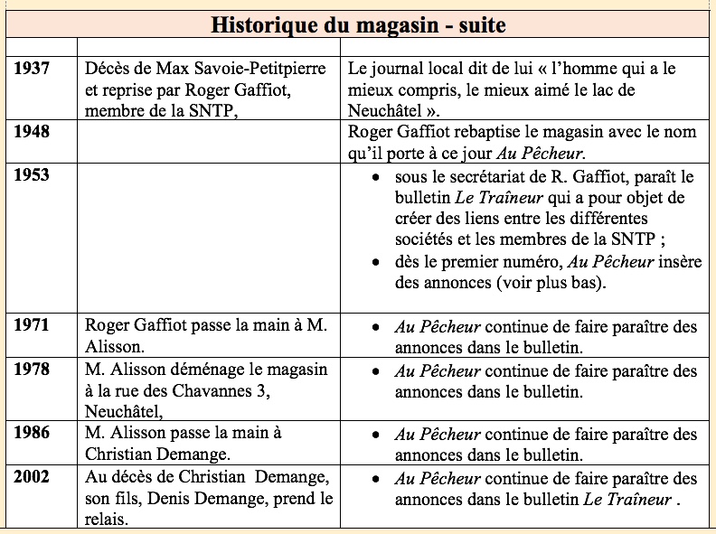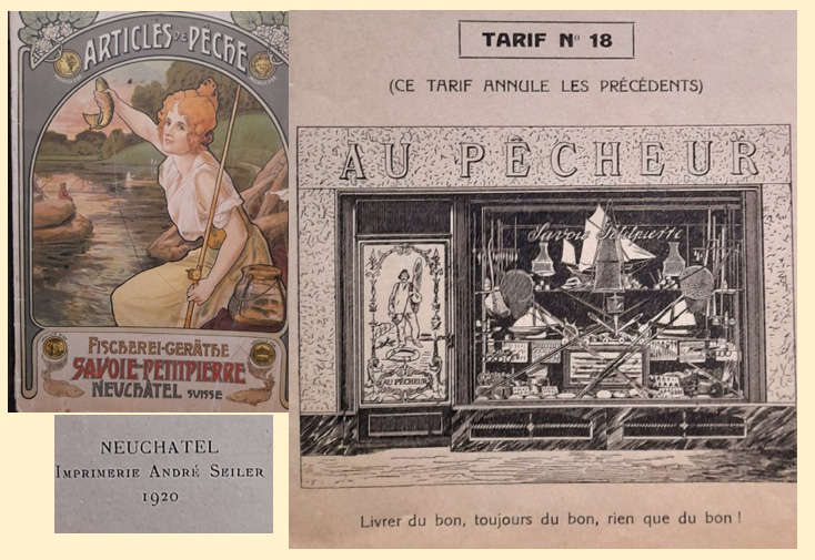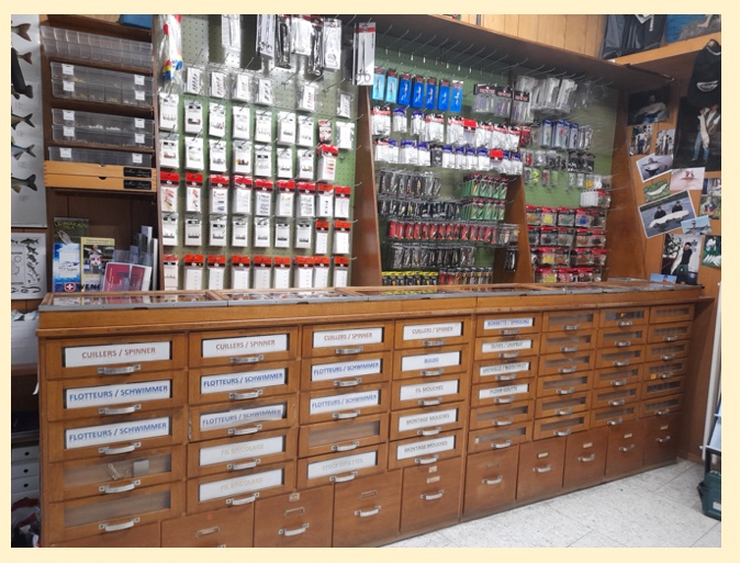 Les tableaux décoratifs. J’avais aussi des planches recouvertes de tissu que j’utilisais pour mes masques, maintenant, j’y accroche des photos. Les photos faites par Knut, d’autres faites par moi et divers éléments décoratifs. Pour suspendre les planches, j’avais des ficelles. Roger a trouvé qu’on pouvait mettre du fil de pêche et cela me conduit Au Pêcheur, le magasin d’articles de pêche le plus ancien, non seulement du canton, non seulement de Suisse romande, mais de la Suisse entière ! Le patron, Denis Demange, est un homme à l’écoute des clients et c’est un plaisir que de parler avec lui. J’ai une rubrique dans ma plateforme qui traite du commerce au centre-ville. Les conversations avec M. Demange se sont transformées, tout naturellement, en un article sur le magasin. Bref, il me sort d’embarras, car le fil nylon de pêche que j’ai utilisé avec succès dans d’autres domaines s’est révélé… très plastique… soit, il n’a cessé de s’allonger et mes tableaux suspendus allaient peu à peu toucher le sol.