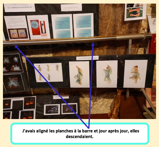Le travail derrière, ici aussi. Suivant les conseils reçus, j’avais enlevé les vis à bois sur les panneaux, mis des punaises au dos et là… pour savoir exactement à quel endroit le panneau était suspendu… et quand un côté était fixé, l’autre sautait… mais, une fois de plus, quand le résultat fait plaisir, les déplaisirs précédents disparaissent.