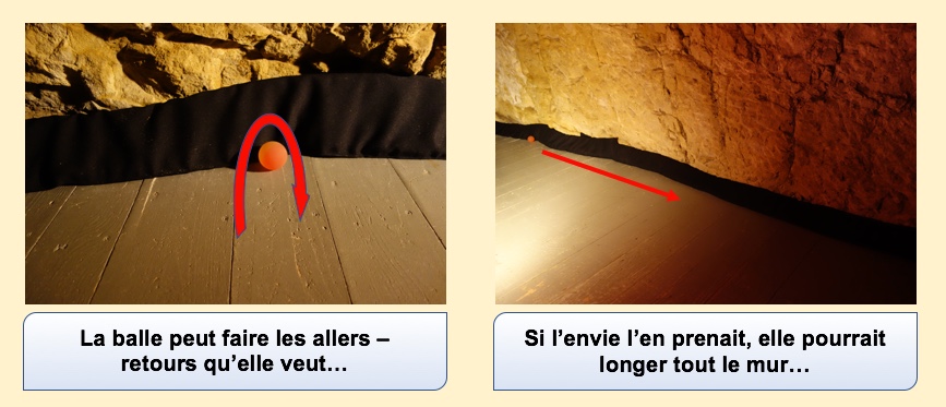 Pour le plaisir. J’ai bien sûr essayé la résistance et efficacité de mes bandes. C’est un plaisir que de laisser rouler les balles, de les laisser aller jusqu’au bout de leur trajet sans devoir courir après elles et se dire « pourvu qu’elles n’aillent pas dans un trou ». Alors, je fais plein d’essais dans un état proche de la béatitude.