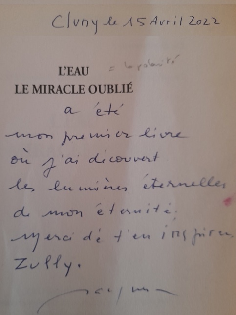 L’eau. L’eau est un élément fondamental dans notre existence ; si elle représente 60 à 70 % de notre poids, du point de vue des molécules, elles sont à 99,6 % des molécules d’eau ! Il y a des théories qui disent que l’eau est arrivée sur Terre par des météorites, et d’autres qui disent qu’il y en avait déjà. Le fait est que l’eau est curieuse, elle est le seul élément qui en gelant augmente de volume et flotte. Nous le constatons tous les jours et prenons cela pour un état normal, mais c’est l’exception, c’est vraiment curieux.