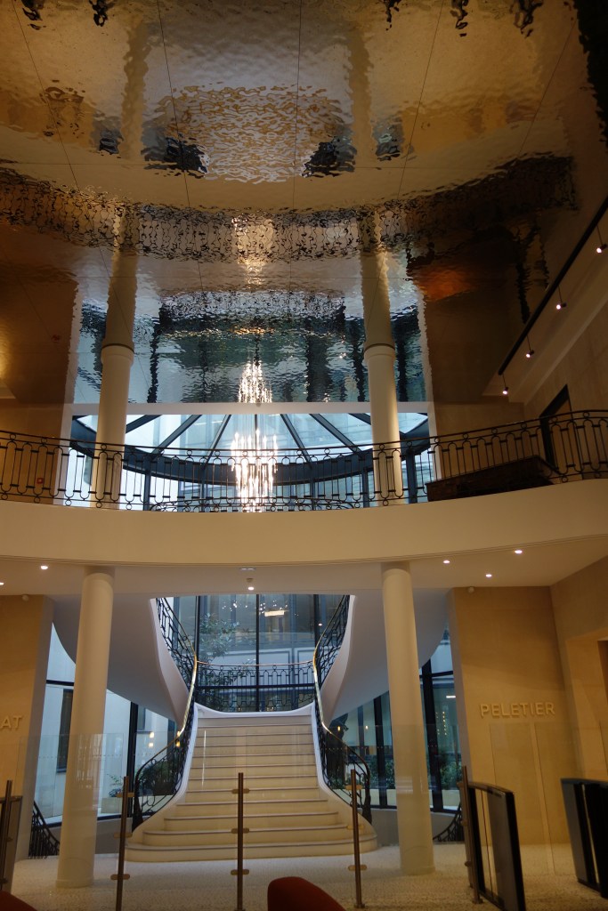 Entrée du Figaro : tout s’imbrique si naturellement que l’image fait une unité. Le reflet me transporte dans des dimensions absolument extraordinaires, je suis dans une sorte d’extase. Roger a été émerveillé et se dit également inspiré. Je suis ravie. Il ajoute qu’il a beaucoup de respect pour les architectes français. Ils arrivent à allier les styles historiques avec des éléments modernes. Ici le plafond est fait d’acier inoxydable martelé et poli, ce qui donne ces effets absolument remarquables.