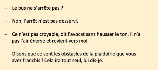 Je ne sais plus très bien ce que l’avocat a dit, mais on était d’accord pour dire que l’argent et le pouvoir prenaient parfois le dessus sur la justice. Et voilà que le bus arrive au quartier de l’Horloge et passe à côté du Palais de Justice. L’avocat me dit au revoir et il se met devant la porte. Le bus passe tout droit devant l’arrêt. L’avocat va vers la jeune femme qui conduit le bus.