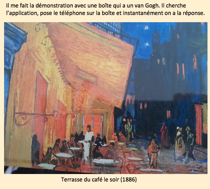 Non seulement Driss ne m’en veut pas, ne me fait pas de reproche, mais en plus, il m’apprend des choses et tout cela avec le sourire et le coeur ouvert. Je lui dis que je vais écrire un article sur lui sur ma plateforme et ne peux que me pencher pour choisir des souvenirs. Je choisis la boîte « Van Gogh » et d’autres choses dont des cartes postales. Au moment où je lui demande combien je lui dois, il me dit le montant et ajoute : « Je n’ai pas compté les cartes postales ». C’est absolument inouï. De plus, les cartes postales ont comme image le Sacré-Coeur et la place de la Concorde. Deux places qui me tiennent à coeur à Paris. Avec la place de la Concorde, j’ai un lien spécial parce que liée à Ramsès ii. et au sujet duquel je prépare un article sur cette plateforme. Je me sens portée !