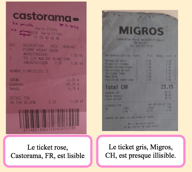 2. Ticket rose chez Castorama. Je vais dans ce grand magasin pour acheter des articles pour le bricolage et reçois un ticket rose. Je suis surprise parce qu’à Neuchâtel, la mode est au gris, un vieux gris qui rend les tickets illisibles. Les gens qui mettent en circulation de tels tickets veulent bien faire mais ignorent les conséquences. Tout le monde parle de la planète et de l’écologie et s’y prend par bouts. Avoir conscience que tout ce qu’on fait a une conséquence est magnifique, dans le cas présent, la solution proposée va à l’encontre de la vision physiologique. Pour bien voir, il faut un contraste, le mieux est noir-blanc, sitôt que l’on met une couleur, cela exige un effort des yeux, or dès qu’il y a effort, la vue s’abîme. La population européenne est vieillissante et donc il faudrait lui éviter des efforts. Alors, ceux qui pensent bien faire, ne prennent pas en compte tous les facteurs. C’est désolant. Le gris du magasin suisse Migros est affreux, Aldi suit aussi, c’est désolant. Alors, voir du rose c’est déjà mieux. Je regarde donc mon ticket et dis au caissier :