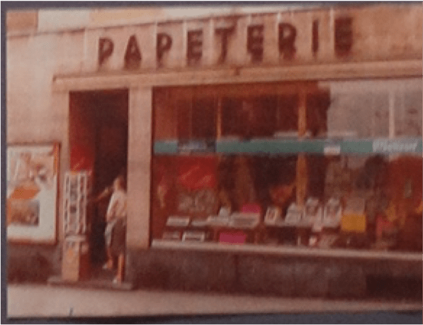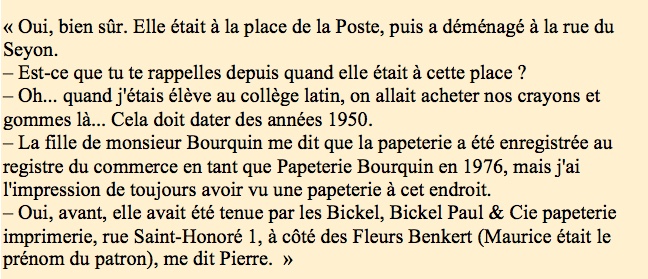 Mon paysage commercial. Les commerces tenus par des Neuchâtelois sont donc devenus rares : la Boucherie Margot, deuxième génération, la Boulangerie Maeder, deuxième génération, la Droguerie Schneitter, troisième génération qui prépare la quatrième, et la papeterie Bourquin qui est reprise par Nathalie, troisième génération. Sur son enseigne est écrit « Papetier Bourquin », c’est si joli. En fait en un mot il dit que chez Bourquin, on fait le commerce du papier et, par extension, des articles de bureau (Académie française).