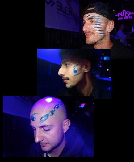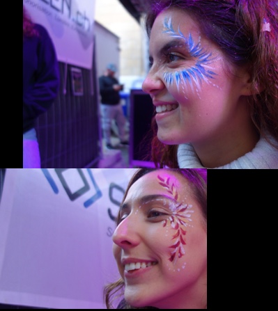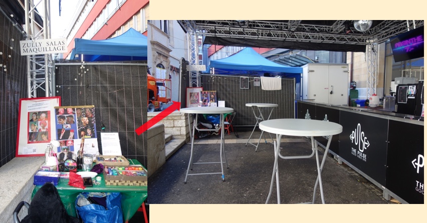 Il faut préciser que lorsque je suis arrivée pour m’installer, j’ai eu la surprise de ne plus voir Xamax mais The Pulse comme je viens de le dire. Ce sont eux qui sonorisent bien des stands à la fête des Vendanges. Le chef, Mica, non seulement m’a dit bonjour, mais, a fait en sorte que je puisse occuper un coin dans son périmètre et m’a fait prêter une rallonge afin que je puisse avoir de l’électricité. Autrement, j’aurais été derrière le stand et donc… invisible… J’ai fait connaissance avec tout le personnel et le troisième jour, ceux qui travaillaient au stand se sont fait maquiller par moi. Cela a été un grand plaisir ! C’est en voyant travailler les gens que leur caractère se voit, Mica sait faire face aux imprévus. C’est magnifique !