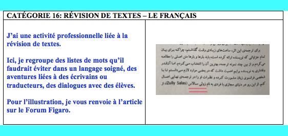 Liens : Révision de textes en français – Révision de textes 2 – Forum Figaro – Dialogue sur la lettre « i » – Mon élève de 15 ans et la poésie – Giovanni 5 ans apprend un mot à Zully – Liste de mots à soigner – Synchronicités – Orthographe-orthographie-graphie.