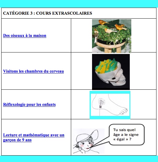 Voici les liens : Des oiseaux à la maison – Visitons les chambres du cerveau – Réflexologie pour les enfants – Lecture et mathématique avec un garçon de 9 ans.