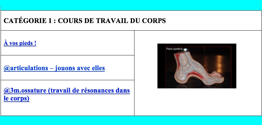 Voici les liens pour la description des cours : À vos pieds ! – @articulations – jouons avec elles – @3m.ossature ; Danse classique et imagination figure dans la catégorie 7.