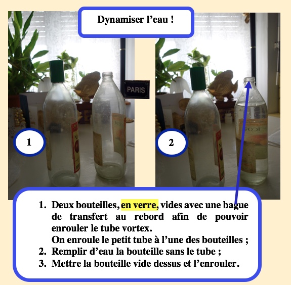 On le sait, l’eau vivante est celle des courants. Pour rendre ses propriétés à l’eau du robinet on peut la filtrer, la dynamiser ou encore utiliser d’autres moyens. Je propose la dynamisation par un vortex ; on utilise un tube qui ne coûte pas cher.